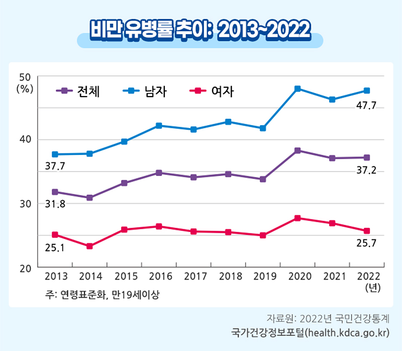 비만이란? 비만이란 체지방이 과다하고 이로 인해 건강상의 문제가 생기는 상태를 말합니다(세계보건기구(WHO) 정의). 그러나 체내 지방량을 정확히 측정하는 방법은 시행하기 어려우므로 대개